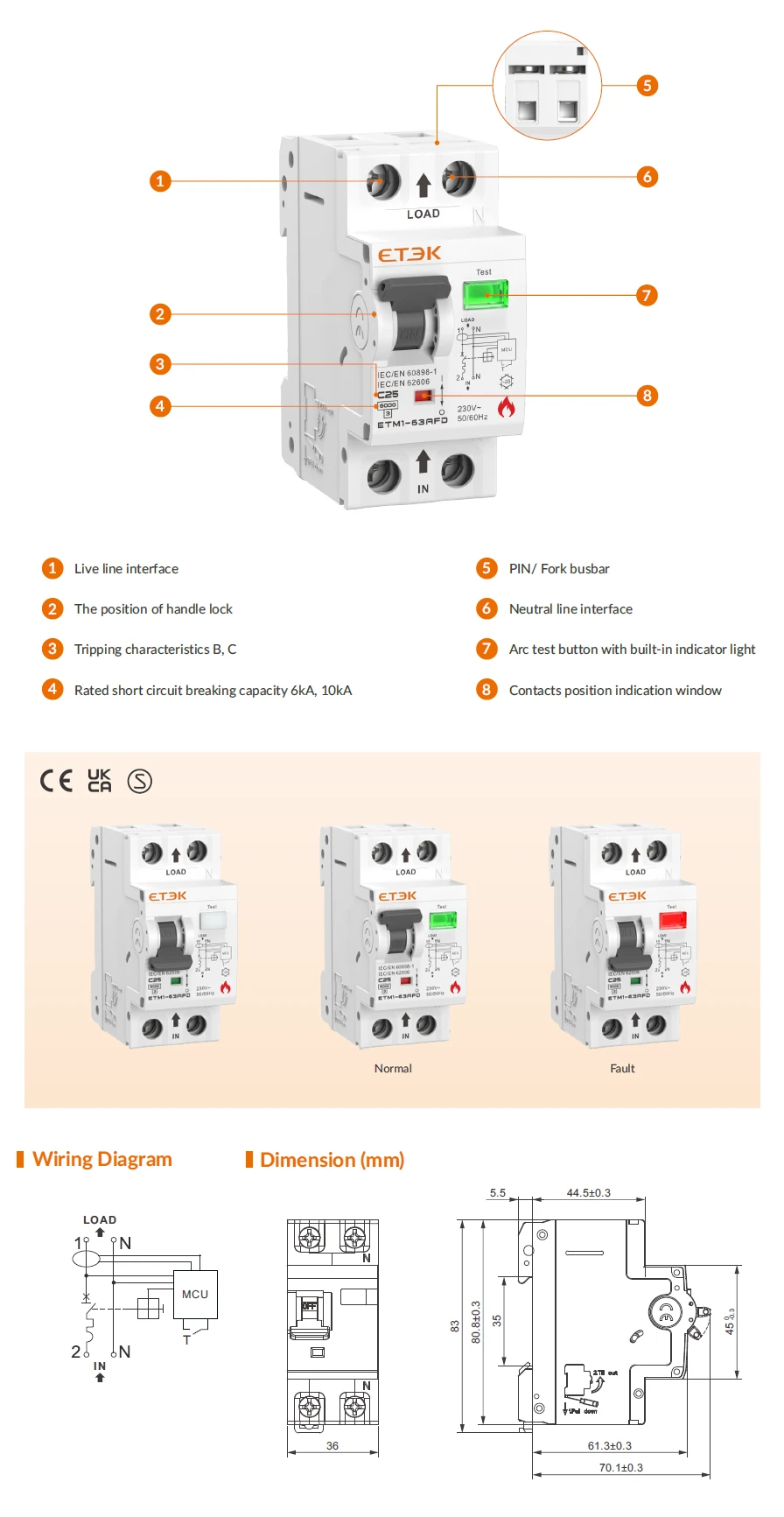ETM1-63AFD features an LED arc-fault indicator for clear status feedback. Its compact 36 mm width saves distribution board space while maintaining comprehensive protection against arc faults, overloads, and short circuits.