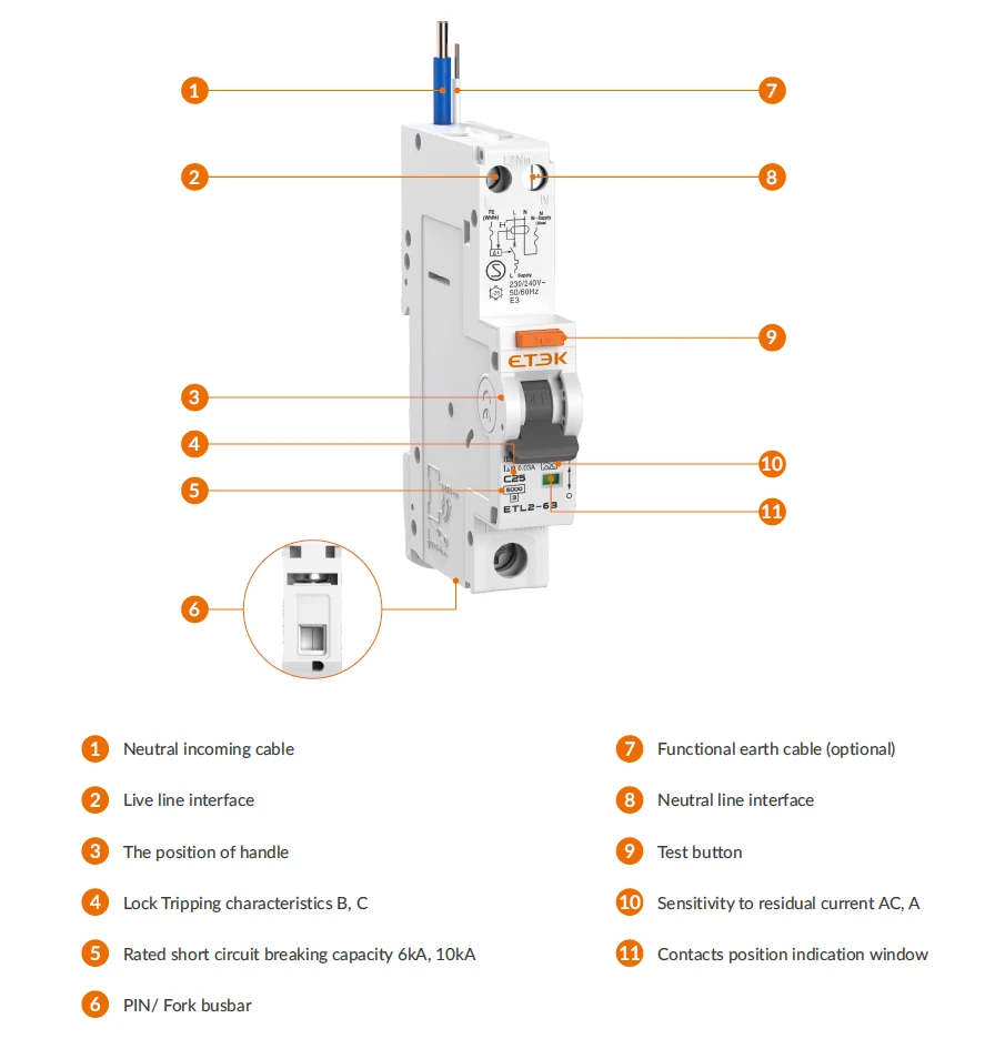 ETL2-63 1P+N RCBO in 1 module width, suitable for installation in chassis distribution boards. provides comprehensive protection against short-circuits, overloads, and earth faults. This device with a blue neutral cable features a 6kA or 10kA breaking capacity and is available in rated currents up to 63A, making it suitable for residential, commercial, and industrial applications. An optional functional earth cable (white) enhances safety in the event of neutral loss. The neutral is unswitched.