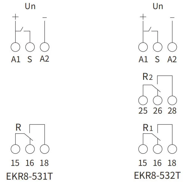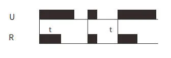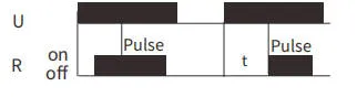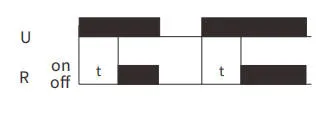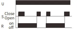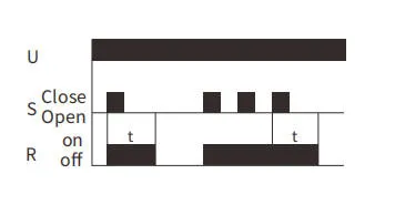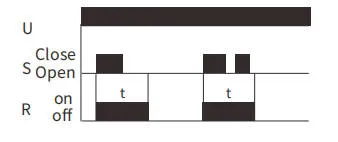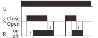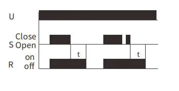 When delay t is complete, contacts R return to their shelf state. If trigger S is closed before time delay t is complete, then time is reset. When trigger S is opened, the delay begins again, and relay contacts remain in their energized state, if input voltage U is removed, relay contacts R return to their shelf state.