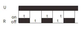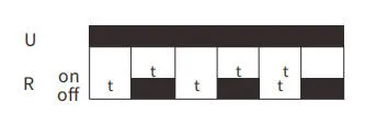 When input voltage U is applied, relay contacts R change state immediately and time delay t begins. When the time t is complete, contacts return to their shelf state for time delay t. This cycle will repeat until input voltage U is removed. Trigger switch is not used in this function.