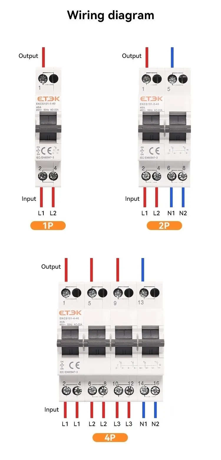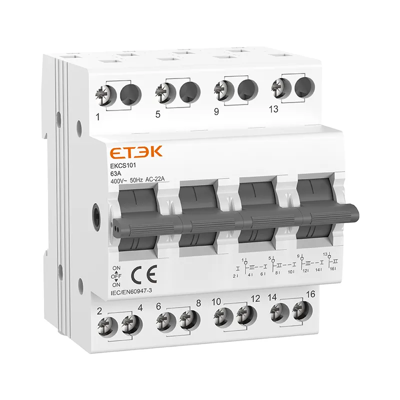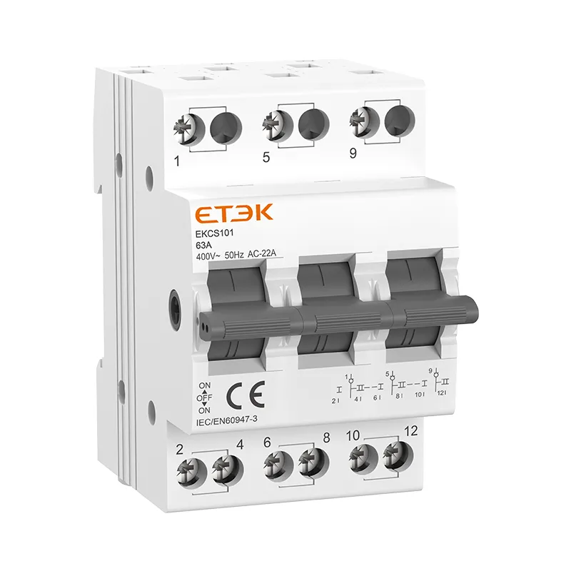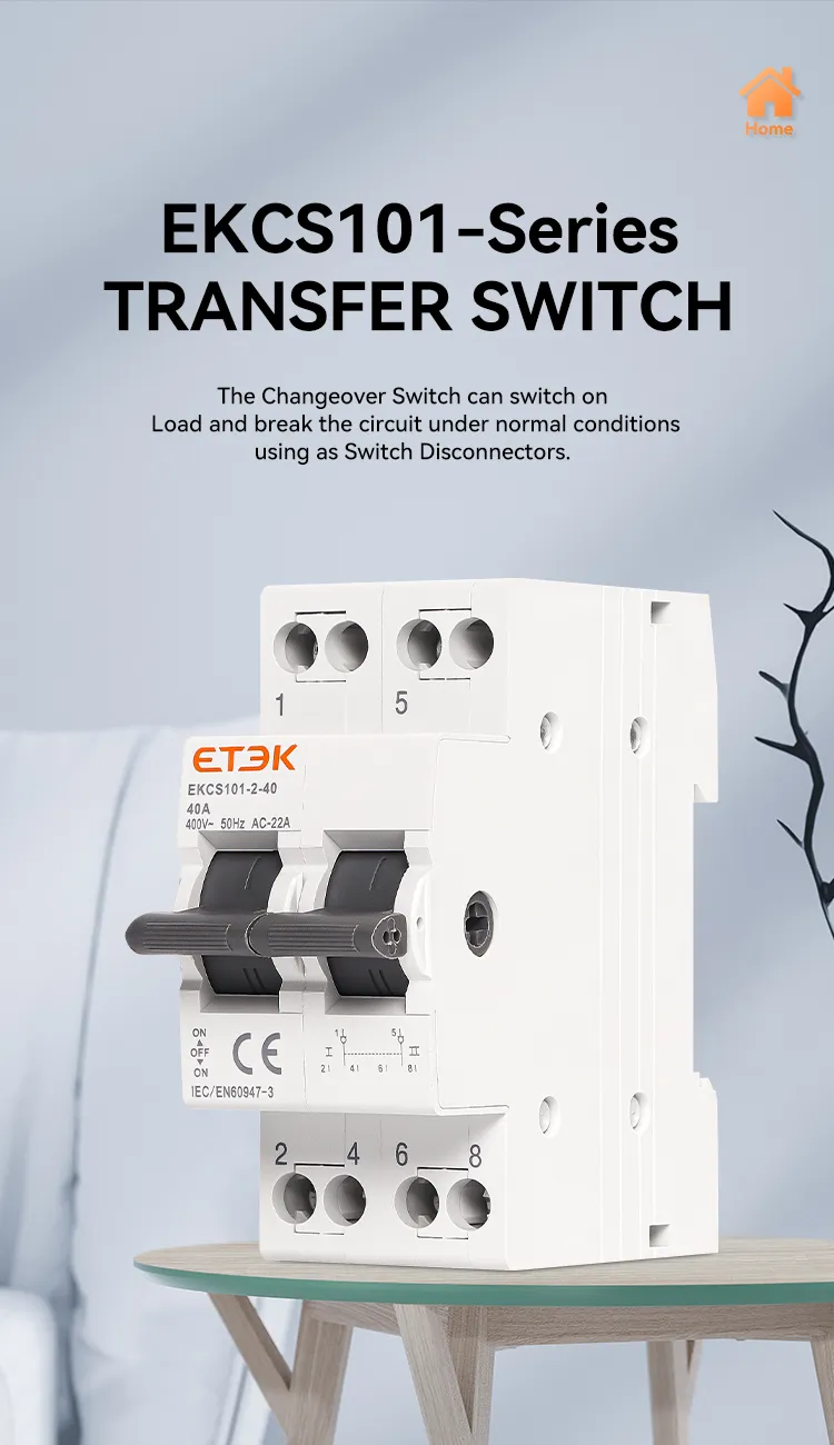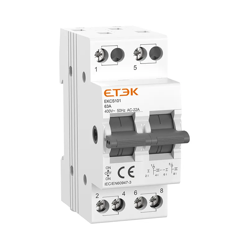 EKCS101 rail-mounted dual power conversion isolation switch has four functions of on, off, conversion and isolation. It can be freely switched on and off between two loads carried by a group of lines, or on two power sources. It is used for on-off and switching between, using DIN standard rail (35×7.5) installation, the shell is made of PA66 injection molding, with high flame-retardant performance, it is an ideal product that needs to be used for switching and opening and closing in industrial equipment and circuits. The maximum current can reach 40A, and it is convenient and safe to install and wire on the guide rail.