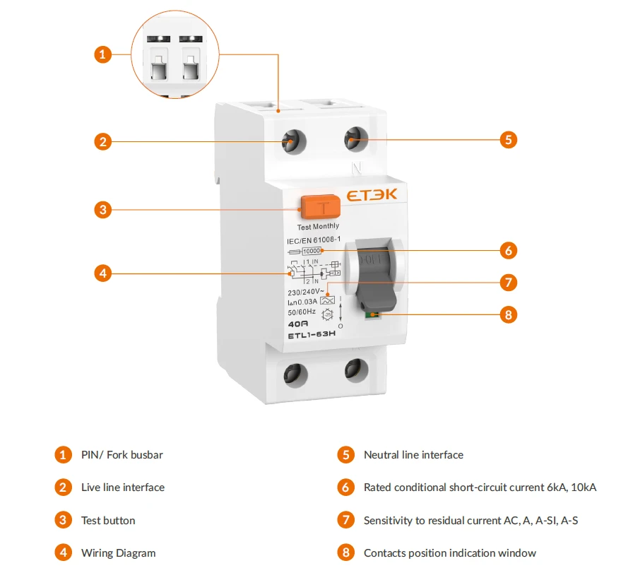 ETL1-63 Residual Current Circuit Breaker (RCCB) offers reliable protection against electrical leakage currents, significantly reducing the risk of electric shock caused by indirect contact. Designed for versatility, it supports both single-phase (240V, 1P+N) and three-phase (415V, 3P+N) power systems, with a rated current capacity of up to 63A. This ensures dependable performance for a wide range of applications in residential, commercial, and industrial environments.