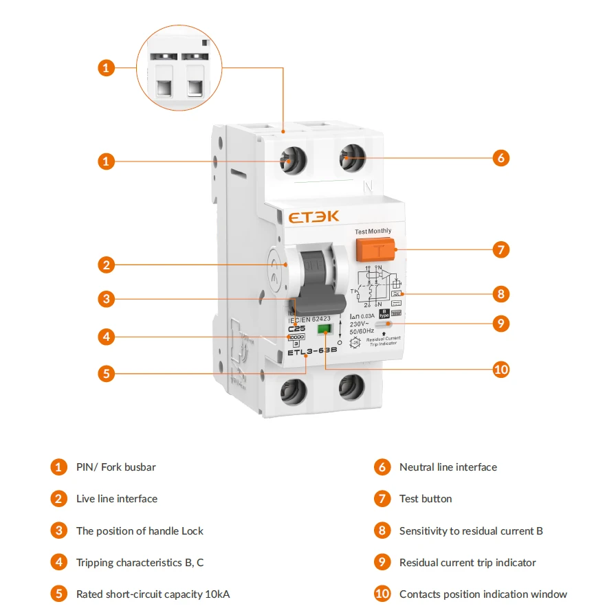 ETL3-63B is an IP+N Type B RCBO (Residual Current Circuit Breaker with Overcurrent protection) with up to 63A rated current, 230/240V rated voltage, 10kA breaking capacity, and 30mA residual current sensitivity. It features both B and C curve characteristics and provides comprehensive protection against overcurrent, short circuit, and earth leakage, with advanced detection of complex waveforms and smooth DC residual currents.