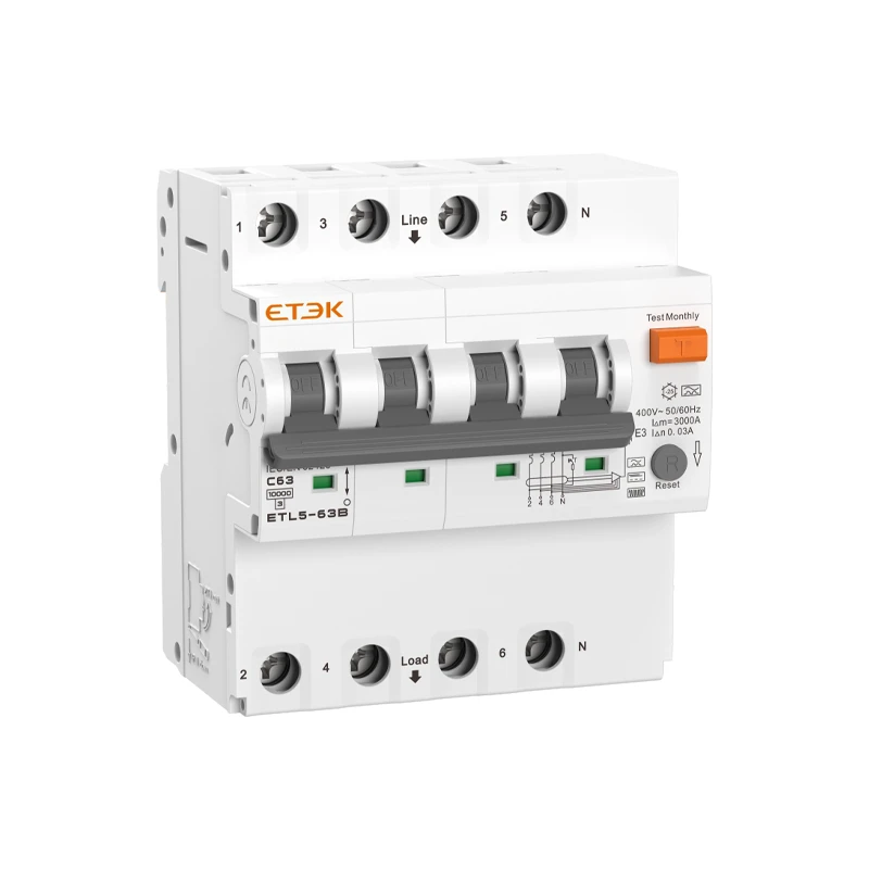 ETL5-63B Type B RCBO (Residual Current Circuit Breaker with Overcurrent protection) is a combined protective device that integrates residual current protection (RCD) and overcurrent protection (MCB), with a rated current up to 63A. It supports single-phase 230/240V and three-phase 400/415V systems, features a 10kA breaking capacity, and meets IEC61009-1 and IEC62423 standards.
