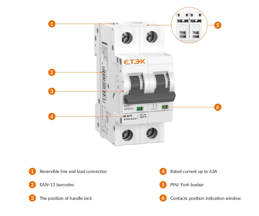 ETM1-63UH Series Miniature Circuit Breaker is specifically designed for terminal power distribution protection in commercial office buildings, residential premises, and general industrial applications. It is suitable for circuits with AC 50/60Hz, a rated voltage of 110/240/415V, and a rated current up to 63A.