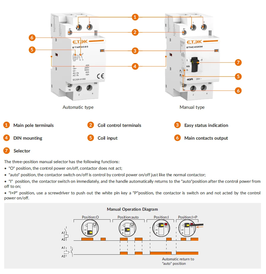 To meet diverse application needs, ETMC contactors are available in both automatic-control and manual-control versions. Their exterior design and dimensions are aligned with the T Series circuit protection products, ensuring a unified appearance and seamless side-by-side installation for consistent panel aesthetics and layout.