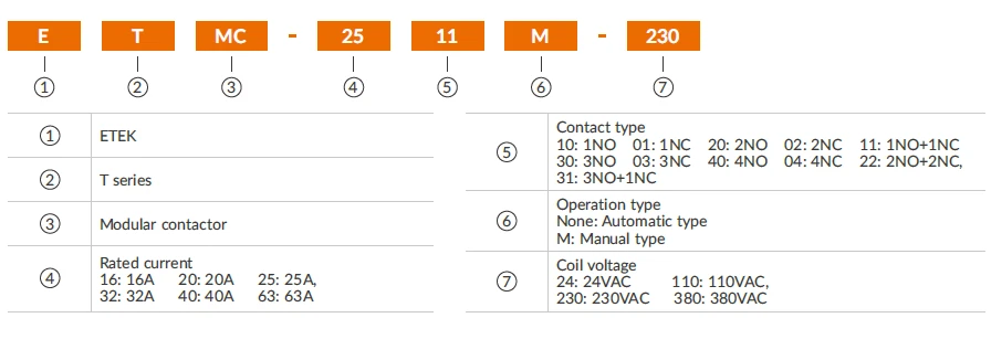 ETMC modular contactors operate on AC 50/60 Hz up to 400 V and 63 A. They switch low-inductive or household motor loads (with derating) and meet IEC/EN 61095 and IEC 60947-4-1 standards. Commonly used for lighting, heating, ventilation, and pumps, they easily mount on DIN rails in panels and boards.
