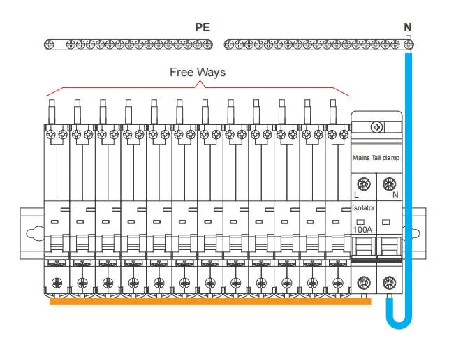 ● Terminal bars: Top‑mounted, color‑coded N and E.