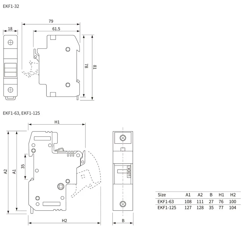 | 125A | EKF1-125-1 | Modular Fuse Base 125A Frame 1P W=35mm | 22x58mm |