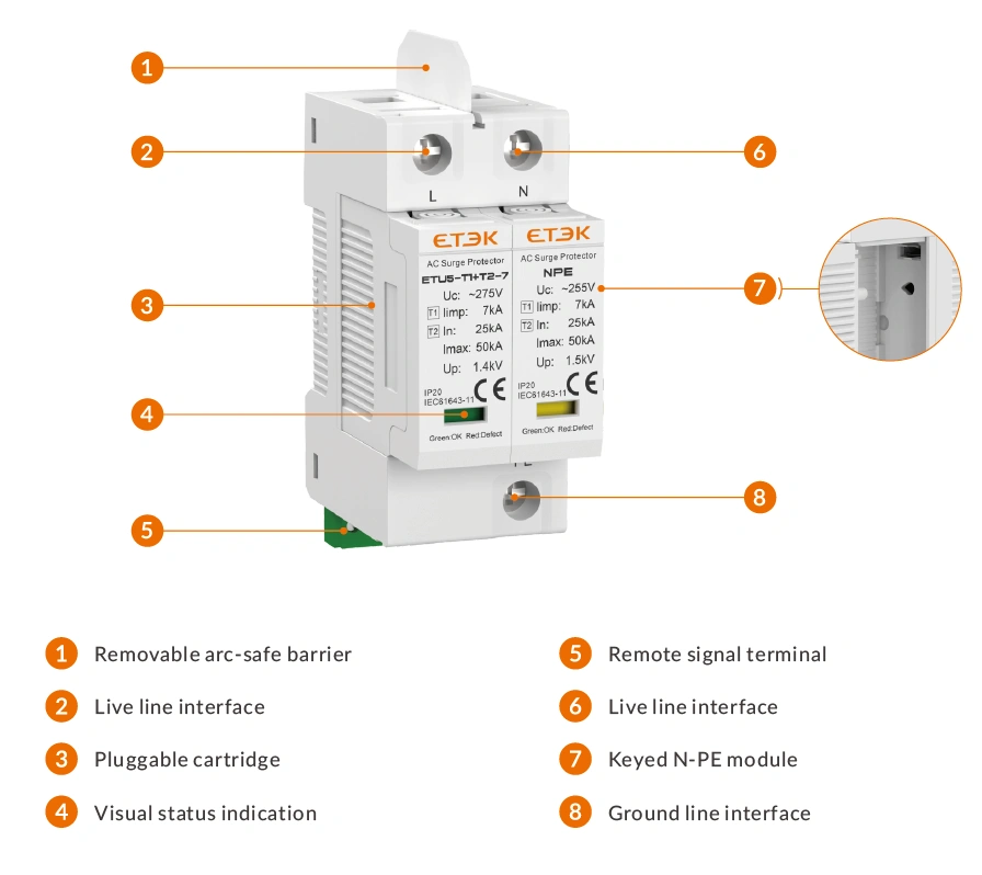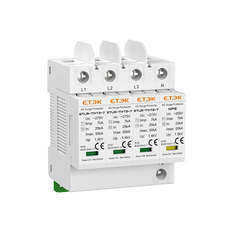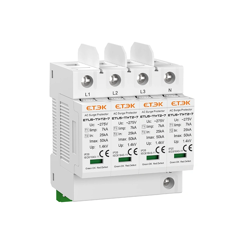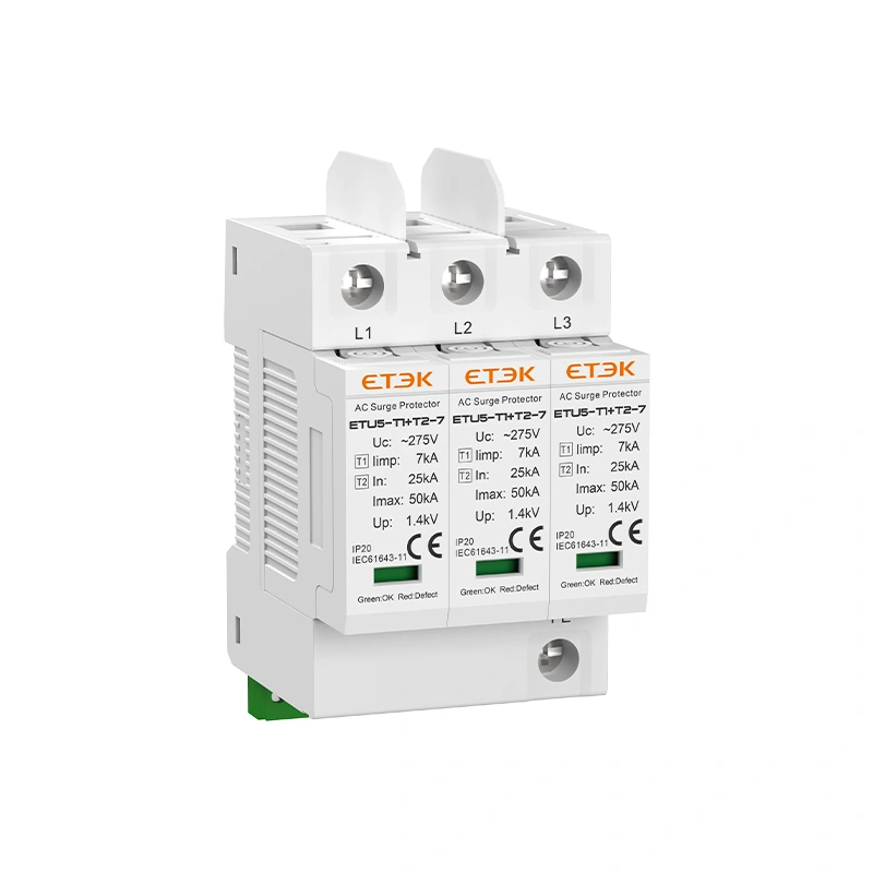 ETU5-T1+T2-7 Series AC Surge Protective Device is designed for lightning surge and switching overvoltage protection in low-voltage power distribution systems. Featuring Type 1+Type 2 combined protection with an impulse discharge current of Iimp 7kA (10/350μs), it is suitable for building main distribution systems, branch distribution panels, industrial control cabinets, and telecom and data rooms.