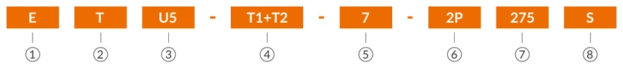 | ② | T series | ⑥ | No. of Poles: 2:2P; 3:3P; 4:4P; 1PN:1P+NPE; 3PN:3P+NPE |