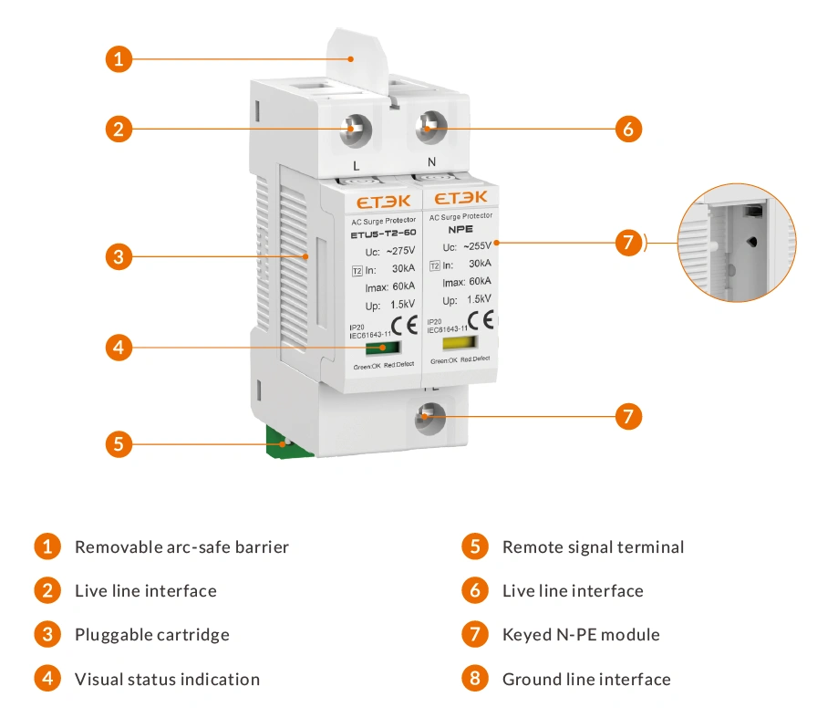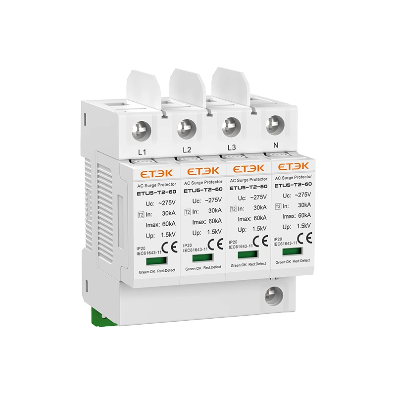 ETU5-T2-60 Series AC Surge Protective Device is designed for surge protection in low-voltage power distribution systems. With Type 2 / Class II protection, in 30kA (8/20μs), and Imax 60kA (8/20μs), it provides reliable protection against lightning-induced surges and switching overvoltages in building and industrial distribution applications.