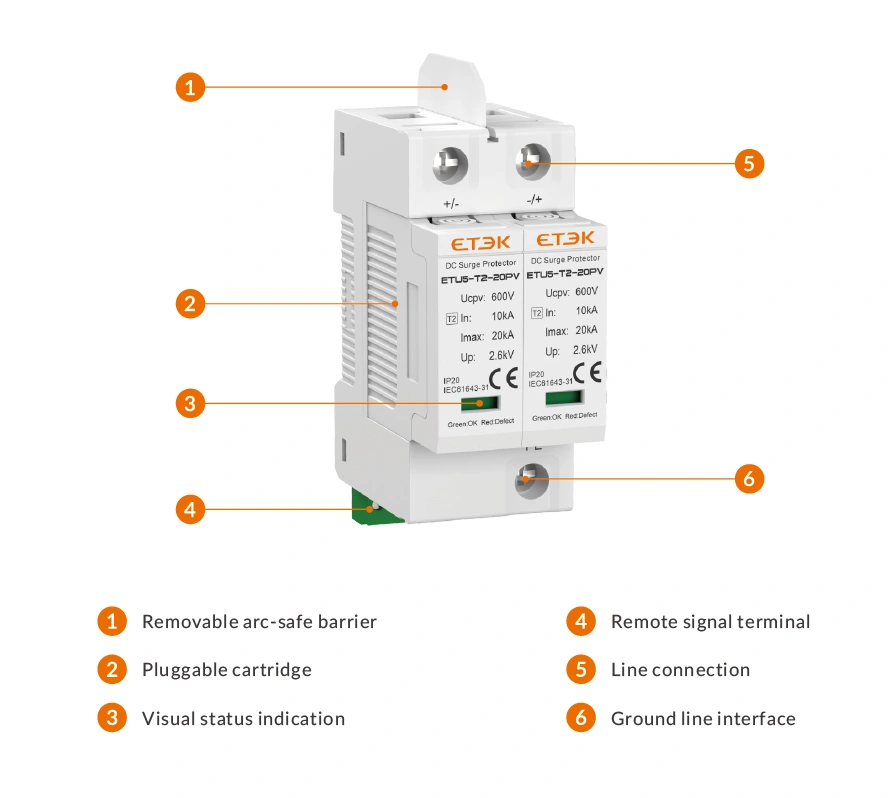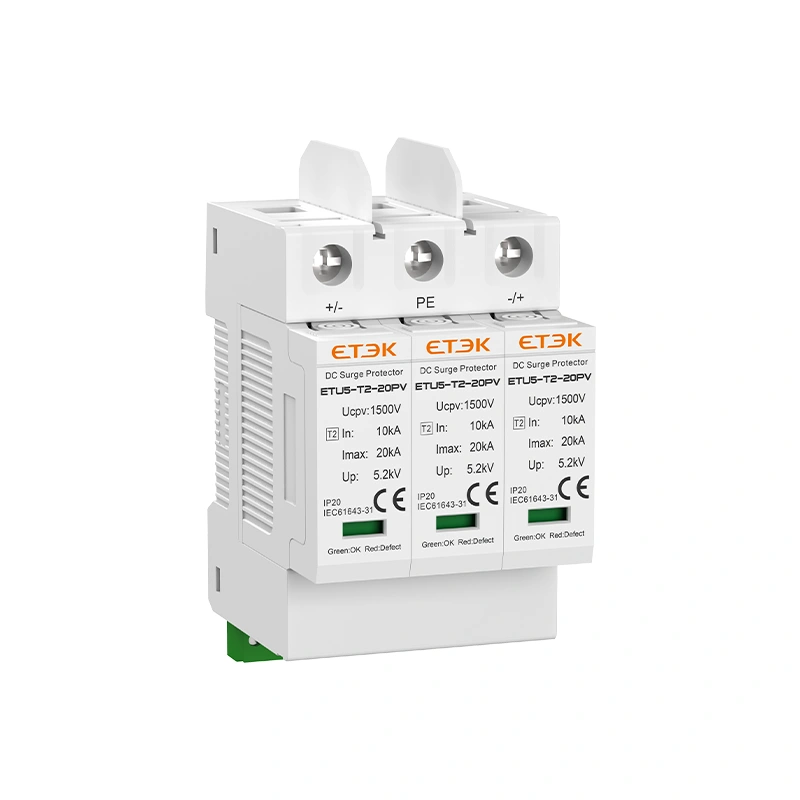 ETU5-T2-20PV Series DC Surge Protective Device is designed to provide reliable surge protection for the DC side of solar photovoltaic systems. It is suitable for use in PV string boxes and inverter DC inputs, helping to reduce the impact of lightning-induced surges and transient overvoltages on critical system components.
